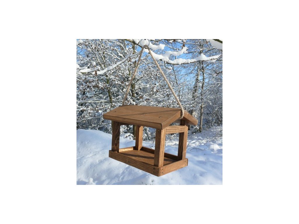 Krmítko pro ptáky ve tvaru domečku je vyrobeno z masivního dřeva.